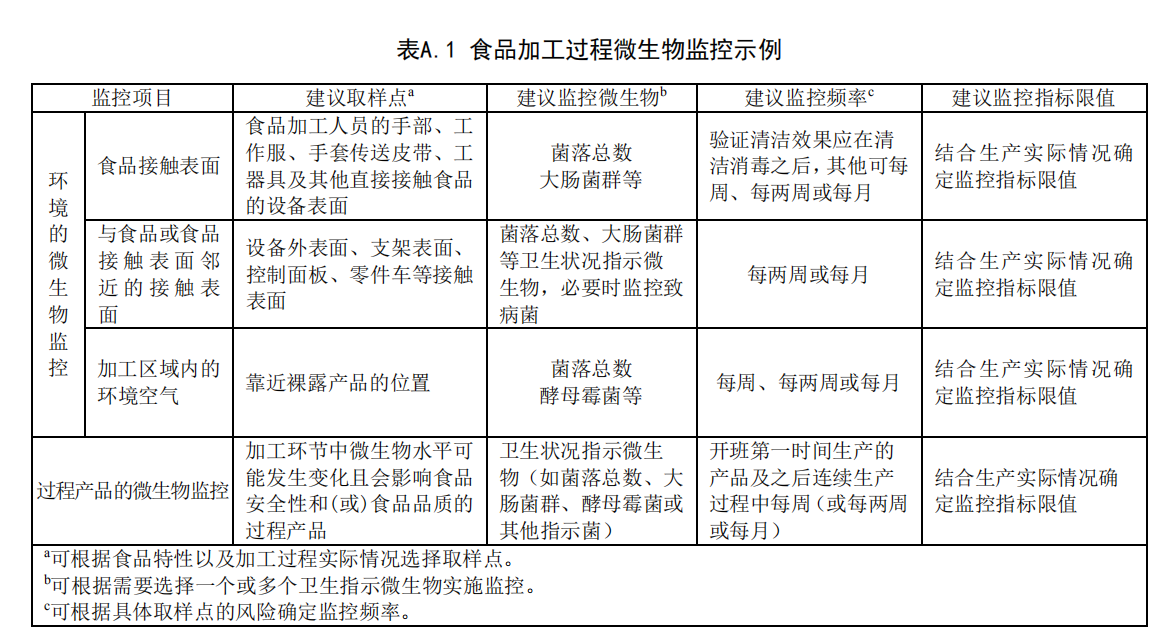 8.2.2.2 食品加工過程的微生物監(jiān)控程序應(yīng)包括:微生物監(jiān)控指標(biāo)、取樣點、監(jiān)控頻率、取樣和檢測方法、評判原則和整改措施等,具體可參照附錄 A 的要求,結(jié)合生產(chǎn)工藝及產(chǎn)品特點制定。